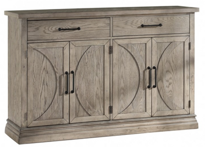 Gorgeous Gray oak veneer, engineered wood, and solid hardwood. Features two drawer and two shelves behind each said of doors.Read More